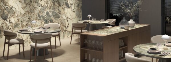 Marmi hebt die Grenzen zwischen Architektur- und Einrichtungsoberflächen auf: Großformatige Feinsteinzeugplatten in beeindruckender Größenvielfalt und gleichzeitig außergewöhnlich dünn. Die Serie verbindet monumentale Wirkung mit erstaunlicher Leichtigkeit – ideal für Böden, Wandverkleidungen, Möbelfronten und Detailelemente. Durch modernste Fertigung entsteht eine homogene, elegante Fläche, die Kraft und Ästhetik gleichermaßen transportiert.